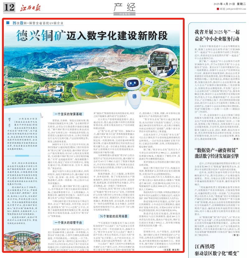 4月29日,江西日?qǐng)?bào)聚焦德興銅礦智改數(shù)轉(zhuǎn)成果,以“圖片+文字”的形式,深度探營(yíng)德興銅礦獲評(píng)全省首批L9級(jí)企業(yè)的數(shù)字化發(fā)展之路。下面,讓我們跟隨外媒的視角,實(shí)地感受德銅的數(shù)字脈動(dòng)。