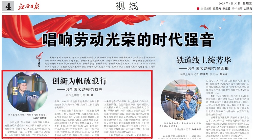 “五一”國際勞動節(jié)前夕,江銅貴溪冶煉廠硫酸車間副主任劉亮被授予2025年“全國勞動模范”榮譽稱號。4月30日,《江西日報》推出《唱響勞動光榮的時代強音》整版特別報道,頭條聚焦全國勞動模范劉亮,著重介紹他的先進事跡,向所有辛勤努力的勞動者致敬。