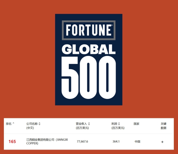 日前,2025年《財(cái)富》世界500強(qiáng)排行榜公布,江西銅業(yè)集團(tuán)有限公司以2024年度776.676億美元營業(yè)收入位列榜單165位,這是江銅自2013年以來連續(xù)13年上榜《財(cái)富》世界500強(qiáng),也是第4年位列榜單前200位。